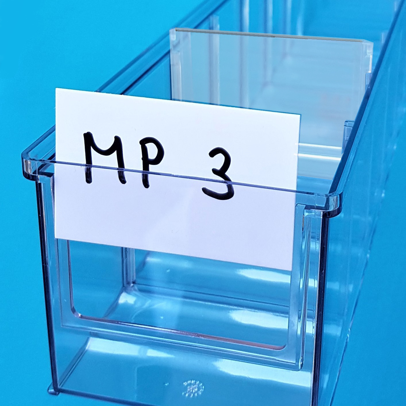 Weisses Kartonetikett zum Beschriften. Passend zu entsprechender Lagerbox.